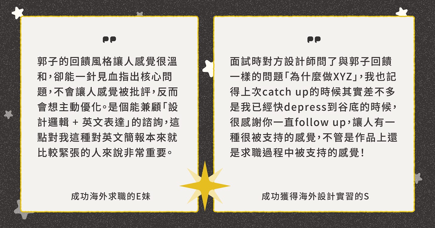 郭子的回饋風格讓人感覺很溫和,卻能一針見血指出核心問題,不會讓人感覺被批評,反而會想主動優化。是個能兼顧「設計邏輯 + 英文表達」的諮詢,這點對我這種對英文簡報本來就比較緊張的人來說非常重要。— 成功海外求職的E妹